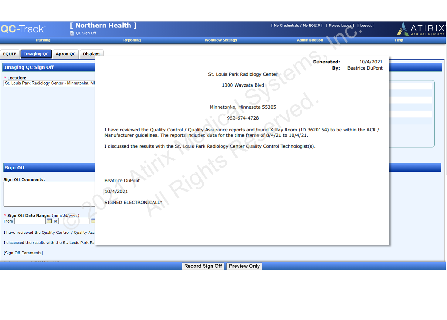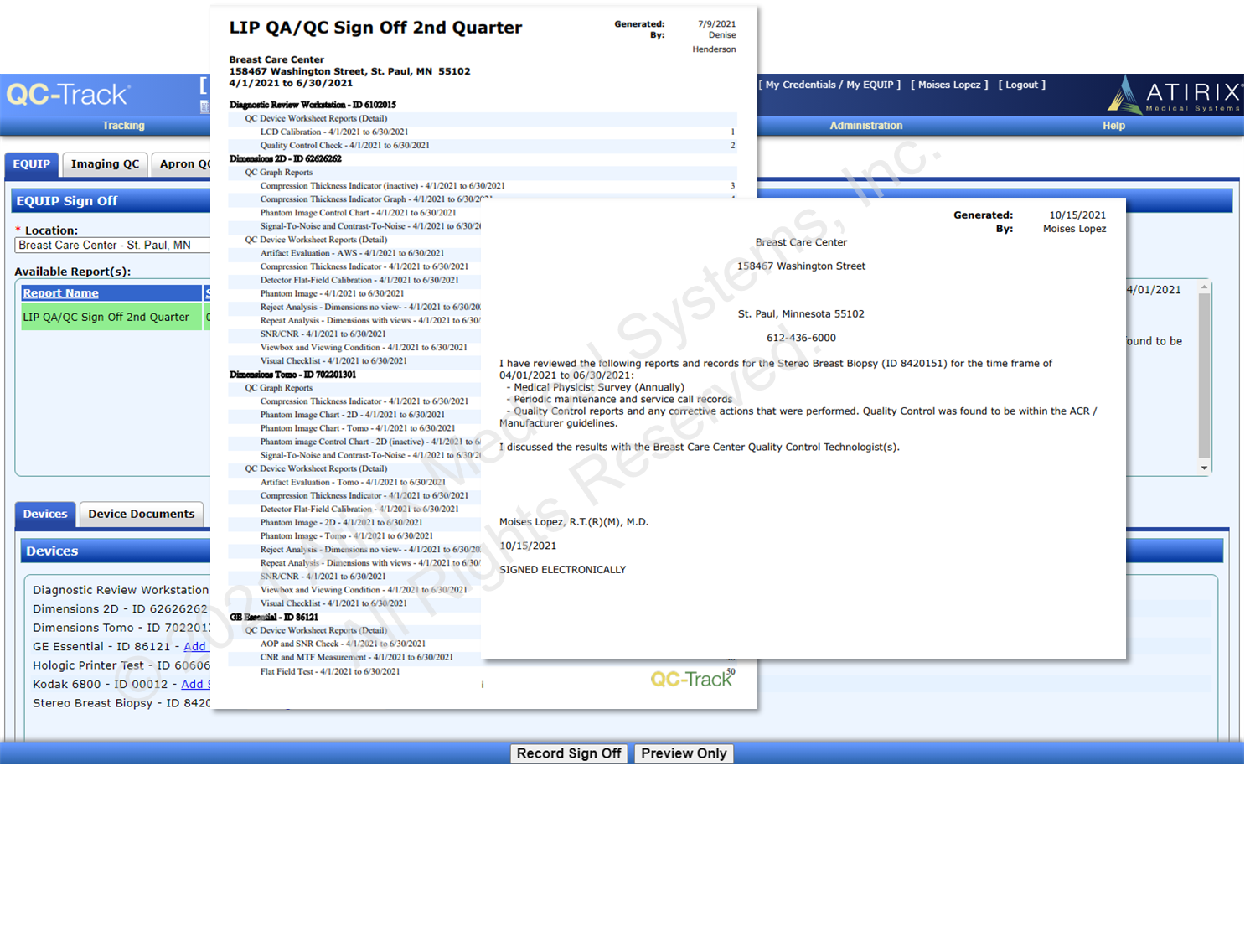 A general purpose Imaging QC Sign Off is available in mammo for the Medical Physicist and mammography management sign off, as well as for modalities outside of MQSA